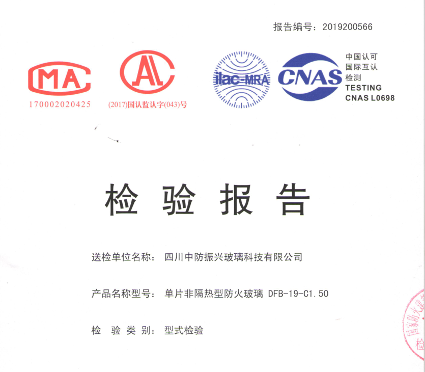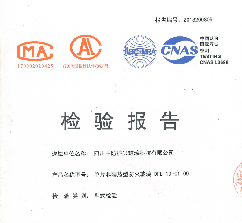 1.5小时19mm厚单片非隔热型防火玻璃,型式检验报告。防火玻璃是一种高端的建筑玻璃,除了具有普通玻璃的性能外,还具有控制火气蔓延、隔烟和隔热等性能,可防止火灾透过隔断和外幕墙波及到建筑...