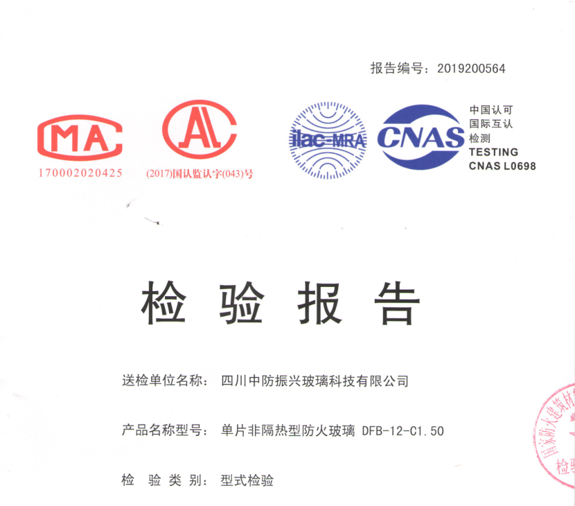 1.5小时12mm厚单片非隔热型防火玻璃,型式检验报告。防火玻璃是一种高端的建筑玻璃,除了具有普通玻璃的性能外,还具有控制火气蔓延、隔烟和隔热等性能,可防止火灾透过隔断和外幕墙波及到建筑...
