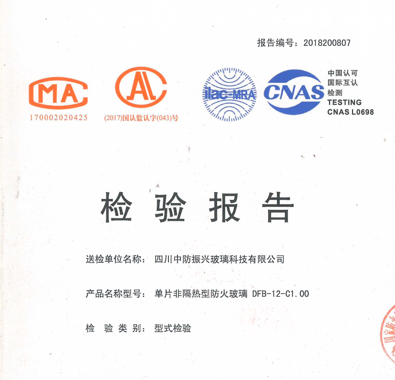 1小时12mm厚单片非隔热型防火玻璃,型式检验报告。防火玻璃是一种高端的建筑玻璃,除了具有普通玻璃的性能外,还具有控制火气蔓延、隔烟和隔热等性能,可防止火灾透过隔断和外幕墙波及到建筑物的...